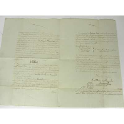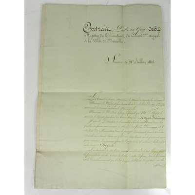 Manuscript document signed by the Mayor of Marseille, Raymond Bains[?], seemingly the minutes or report of a meeting dated 26 July 1815, mentioning the approaching departure of British troops and speaking highly of the troops' contributions "to the cause of the Bourbons", and in gratitude the city will give an engraved urn to Conrad, Baron Exmouth and to Sir Hudson Lowe, alongside staging a banquet, 4pp. each 44 x 29.5cm