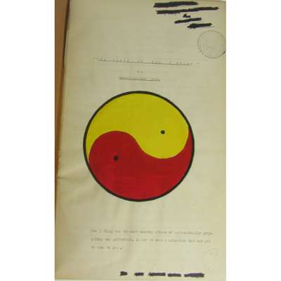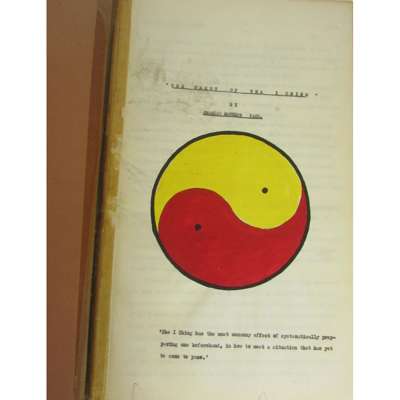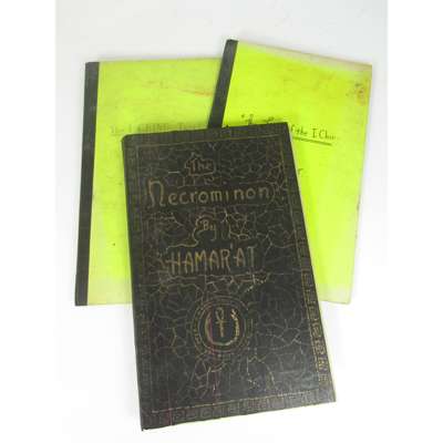 The Sethanic Cult of the Mask's "The Necrominon" by Hamar'at, The Hermetic Book of the Shades, 4to, illustrated typescript/photocopy, 63pp., including a few illustrations hand-drawn, hand-coloured or embellished in pen, contained in black hand-made covers illustrated in gold pen; [Idem] "The Tarot of the I Ching", 4to, typescript, 16pp., with numerous hand-drawn, coloured and laid-in illustrations and a couple of loose elements including a small patch of monochrome woolen embroidery laid into a sheet of brown paper with handwritten German text, bound in yellow card covers, title page with stamp of the Ho[?] Library and an erased address; [Idem] Another copy, with all illustrations drawn and uncoloured, 4to, bound in yellow card covers (3)