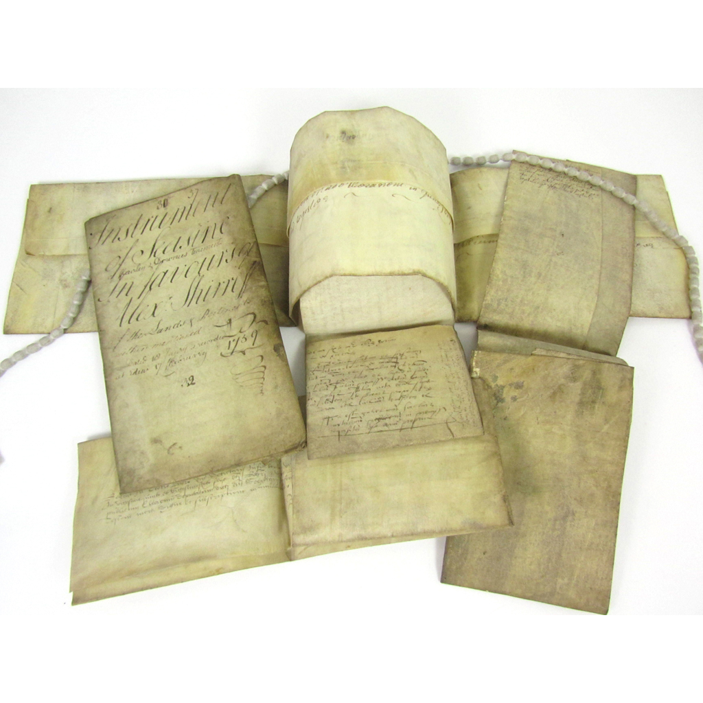 Leith deeds to a property, its history, boundaries, past owners and concluding with the terms and conditions, 1759, c.30 x 45cm; Leith a similar doument regarding a house in Leith, 1706, c.65 x 33cm; Leith another, similar, document regarding a house in Leith, , 1706, c.49 x 31cm; The Carlowrie Estate, near Edinburgh a transfer of property with details including occupation of those involved, the location and concluding with the terms and conditions, 1613, c.27 x 22cm; The Carlowrie Estate, near Edinburgh a similar document to the above, 1606, c.42 x 20cm; The Carlowrie Estate, near Edinburgh a similar document to the above, 1669, c.54 x 26cm; The Carlowrie Estate, near Edinburgh a similar document to the above, 1650, c.64 x 41cm; Argyll and Bute - Tarbert document regarding transfer of property with details given including the sum of money, location within the parish and concluding with the terms and conditions, 1585, c.35 x 20cm; Argyll & Bute - Knapdale and Kilcalmonell a similar document to the above, but later, 1715, c.45 x 48cm; Argyll & Bute - Knapdale a similar document to the above, 1717, c.45 x 48cm; Argyll & Bute - Kilcalmonell a similar document to the above, 1717, c.44 x 28cm; Argyll & Bute - Kilcalmonell a similar document to the above, 1717, 54 x 39cm; Argyll & Bute - Lephanminck in the Paris of Kilcalmonell a similar document to the above, 1718, c.60 x 41cm; Ayr property deed, blue revenue stamp at right hand side, 1756 (14)