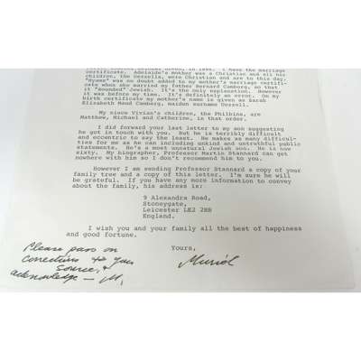 typed letter, signed by Muriel Spark, sent to her cousin in Israel discussing family history, her mother's heritage, and her son, Robin, 30 x 21cm, dated 6th August, 1998; two further typed letters, signed, from Muriel Spark discussing Edinburgh and family history, dated 2003; also two signed postcards and a Christmas note; and several other items, including photocopies of letters (small collection)