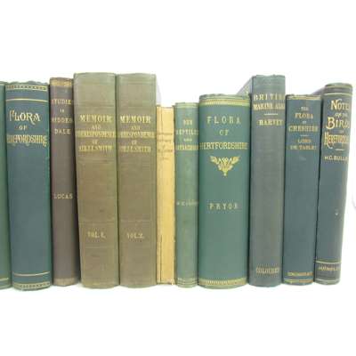 A Description of Malvern. Malvern: for the author, [c.1825], original boards, repaired, worn, one detached; Gorham, G.C. Memoirs of John Martyn, F.R.S. and of Thomas Martyn. 1830, later cloth; Smith, James E. Memoir and Correspondence. 1832, 2 volumes; Duncan, James The Natural History of British Moths. 1836, half morocco, lettered volume 1 on spine; A Guide through the Town of Shrewsbury. 1845, lacks spine; Webb, R.H. Pryor, Alfred R. A Flora of Hertfordshire. 1887; Flora Hertfordiensis. 1849, red calf gilt; Harvey, William H. A Manual of the British Marine Algae. 1849, hand-coloured plates; Dickinson, Joseph The Flora of Liverpool. 1851; Swete, Edward H. Flora Bristoliensis. 1854, 2 plates, map in pocket; Lucas, Joseph Studies in Nidderdale. [c.1872]; Bull, Henry G. Notes on the Birds of Herefordshire. 1888; Purchas, W.H. A Flora of Herefordshire. [c.1889]; De Tabley, Lord The Flora of Cheshire. 1899; Cooke, M.C. Our Reptiles and Batrachians. 1893, chromolithograph title & plates; Lington, William R. Flora of Derbyshire. 1903, presentation copy from the author; Amphlett, J. The Botany of Worcestershire. 1909; Linton, E.F. Flora of Bournemouth, [1900], stamp to endpaper; Stephenson, T.A. The British Sea Anemones. 1928, 2 volumes; Grose, Donald The Flora of Wiltshire. 1957; and c. 80 others; sold not subject to return