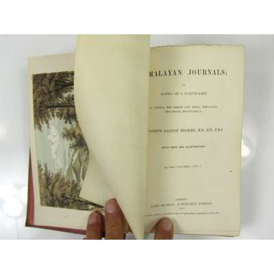 Himalayan Journals, or Notes of a Naturalist in Bengal, the Skikkim and Nepal Himalayas. 1854. First edition, 2 volumes, 8vo, 2 folding maps, 12 lithographed plates (1 folding), illustrations, original pictorial cloth, heads of spines worn