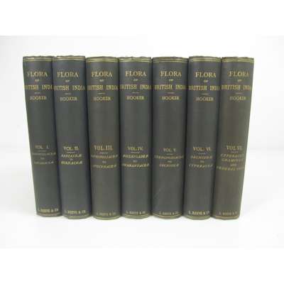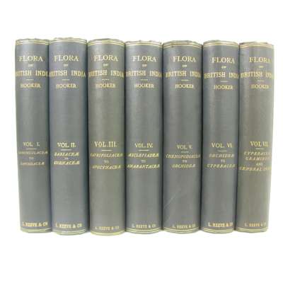 A Sketch of the Flora of British India. 1904, original wrappers, wrappers inscribed "with the author's kind regards"; Hooker, J.D. The Flora of British India. 1875. 7 volumes, 8vo, original cloth; [Anon.] AA Sketch of the Life of Francis Hamilton (once Buchanan) sometime Superintendant of the Honourable Company's Botanic Garden, Calcutta. Calcutta, 1905. Large 4to., original quarter cloth, worn; Rawat, I.S. Indian Explorers of the 19th century. 1973, dustwrapper; Bor, N.L. Manual of Indian Forest Botany. 1953, presentation copy, dustwrapper; Bor, N.L. Some beautiful Indian Climbers and Shrubs [extracted from Journal of the Bombay Natural History Society]. 1939, plates, green half morocco; Brandis, Dietrich Indian Trees. 1906. Inscribed "with the author's compliments, Nov. 1906", original cloth, slight marginal dampstaining, worn; Willis, J.C. A Revision of the Podostemaceae of India and Ceylon. [extracted from Part 3 vol. 1 of the Annals of the Royal Botanic Gardens, Peradeniya], inscribed "with the author's kind regards", half calf, spine faded;Burkill, I.H. Notes from a Journey to Nepal, bound with 2 other extracts from the Records of the Botanical Survey of India. Calcutta, 1910; Coventry, B.O. Wild FLowers of Kashmir. Series 1-3, coloured plates, original pictorial cloth; Collett, Sir H. Flora Simlensis, a handbook of the flowering plants of Simla. Calcutta & Simla, 1902, folding map, illustrations, cloth, sold not subject to return (19)