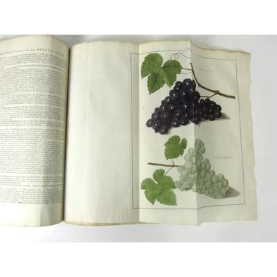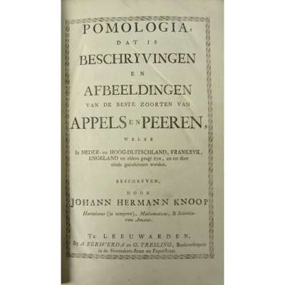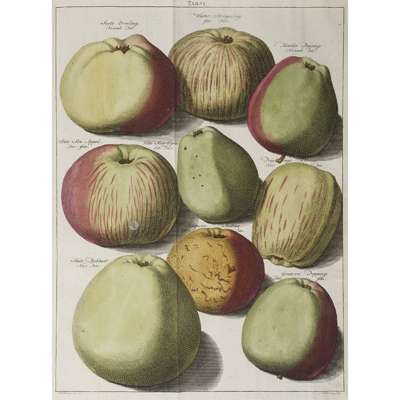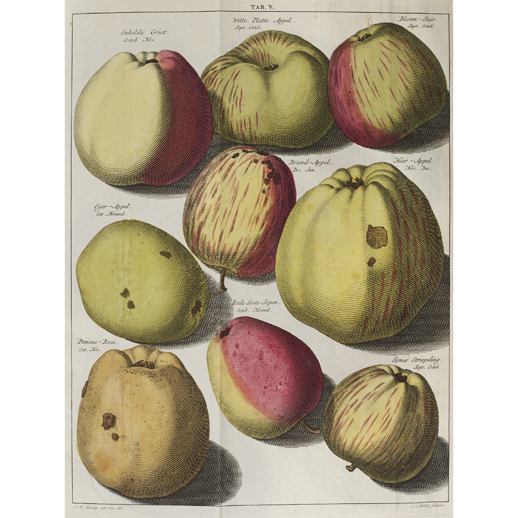 Pomologia dat is Beschryvingen en Afbeeldingen van de Beste Zoorten van Appels en Peeren... Leeuwarden: A. Ferwerda & G. Tresling, [1758] Folio, 20 hand-coloured plates; [bound with] Fruchtologia of Beschryving der Vrugtbomen en Vrugten. Leeuwarden, [1763]. Folio, 19 hand-coloured plates; [bound with] Dendrologia of Beschryving der Plantagie-gewassen, Leeuwarden, [1763] Folio; contemporary quarter calf over boards, without engraved coat-of-arms, rubbed