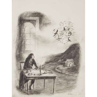 Childermass at Desk, pencil drawing, 36 x 27 cm