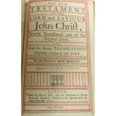 Note: The ESTC [N32302] states that the New Testament title-page should be dated 1703, however in this copy it is dated 1702, whilst the gatherings are complete. The ESTC does not mention this variation, and it is not mentioned in Darlow & Moule [874]. The fore-edge inscription suggests that this Bible belonged to a woman, perhaps as a wedding gift to a new bride.
