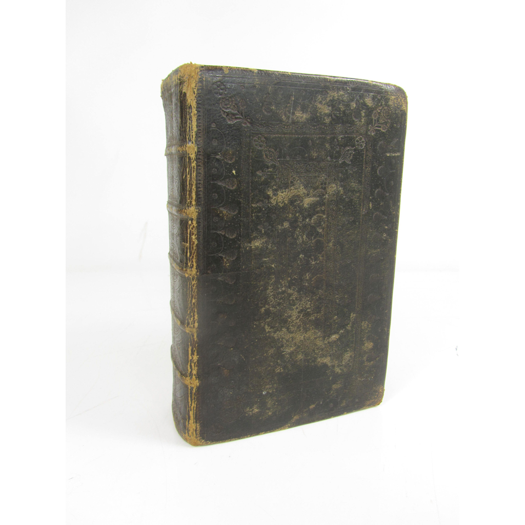 The Holy Bible containing the Old Testament and the New... London: Charles Bill, 1703. 8vo, ruled in red throughout, occasional small, neat tears and repairs [ESTC N32302? but NT title 1702]; [bound with] The Psalms of David in Meeter [sic.] [Edinburgh: George Mosman, 1693]. 8vo, some dampstaining, manuscript notes to rear flyleaf [ESTC R18352]; in a contemporary black morocco cottage-roof style binding with a fore-edge inscription quoting the first half of Proverbs 12:4, in this case rubbed but can be translated as: A wife of noble character is her husband’s crown [New International Version], the initials I.A. in black morocco gilt to front endpaper, covers and spine rubbed with some chipping to spine ends and corners