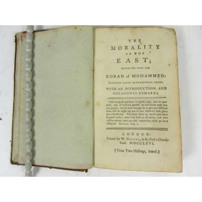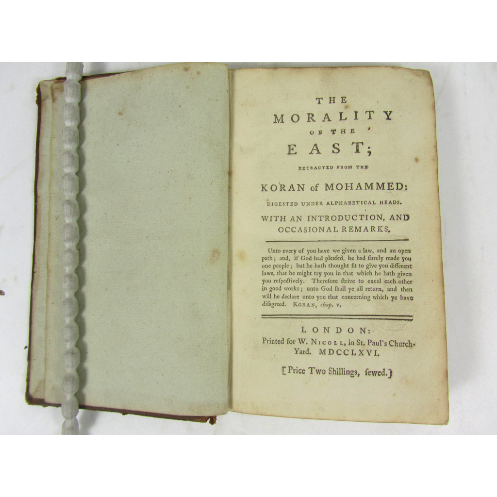 The Morality of the East; extracted from the Koran of Mohammed: digested under alphabetical heads. With an Introduction, and occasional Remarks. London: W. Nicoll, 1766. First edition, small 8vo, contemporary sheep, a little spotting, worn, lacks final blank leaf [ESTC T114169]