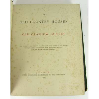 The Old Country Houses of the Old Glasgow Gentry. Glasgow: James Maclehose, 1870. First edition, 4to, one of 120 copies, 100 mounted carbon prints and 2 photographic reproductions of maps, original quarter red morocco gilt with green cloth covers, foxing and some damp-staining (mainly marginal) throughout, hinges splitting, covers worn and rubbed, spine peeling