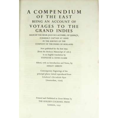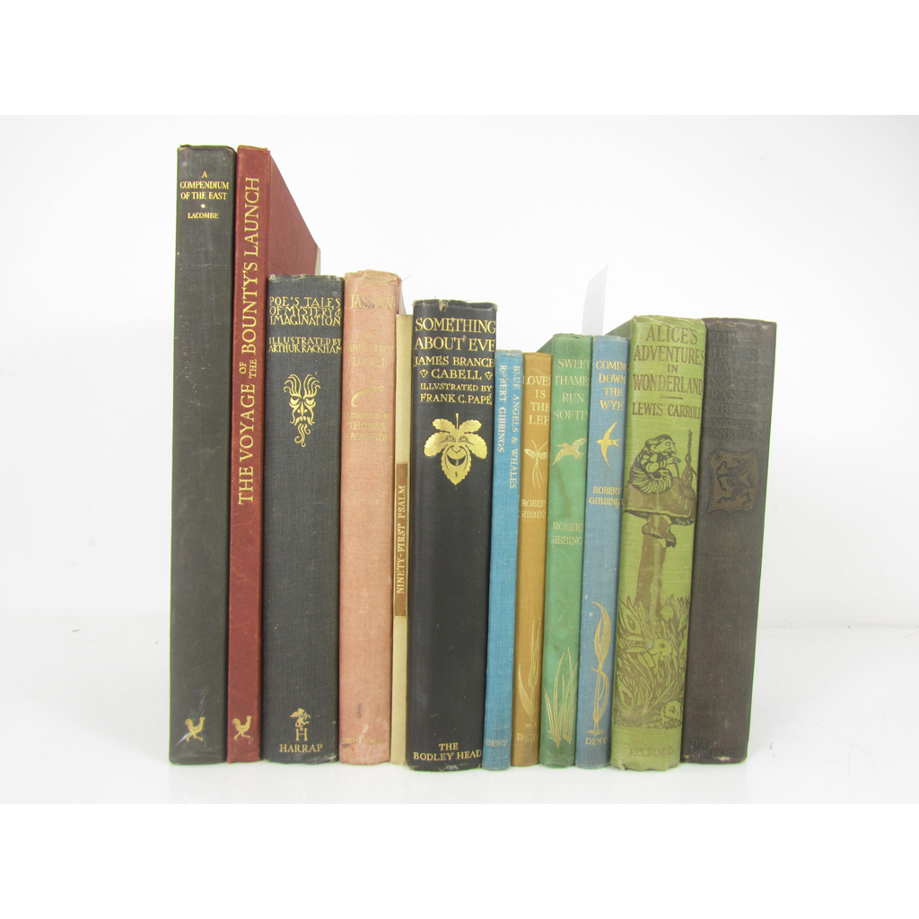 Golden Cockerel Press, 1944. 8vo, number 161 of 350 copies, wood-engravings by Dorothea Braby, original cloth; Gibson, A, editor. A Compendium of the East being an Account of Voyages to the Grand Indies. Golden Cockerel Press, 1937. Folio, number 50 of 300 copies, original cloth, slight spotting and discolouration; Fryer, John The Voyage of the Bounty's Launch. Golden Cockerel Press, 1934. Folio, number 14 of 300 copies, wood-engravings by Robert Gibbings, original cloth, spotting, binding marked; Poe, E.A. Tales of Mystery & Imagination. 1935. First edition, 4to., coloured plates, original cloth; Flecker, J.E. Hassan. 1924. 4to, 12 plates by Thomas Mackenzie, original red cloth, binding faded and worn; Carroll, L. Alice's Adventures in Wonderland. 1926. 4to., 16 colour plates by A.E. Jackson, original cloth; Cabell, J. The Silver Stallion1928; Something about Eve, 1927, illustrations by Franck C. Papé, original cloth, rubbed; and 4 others (12)