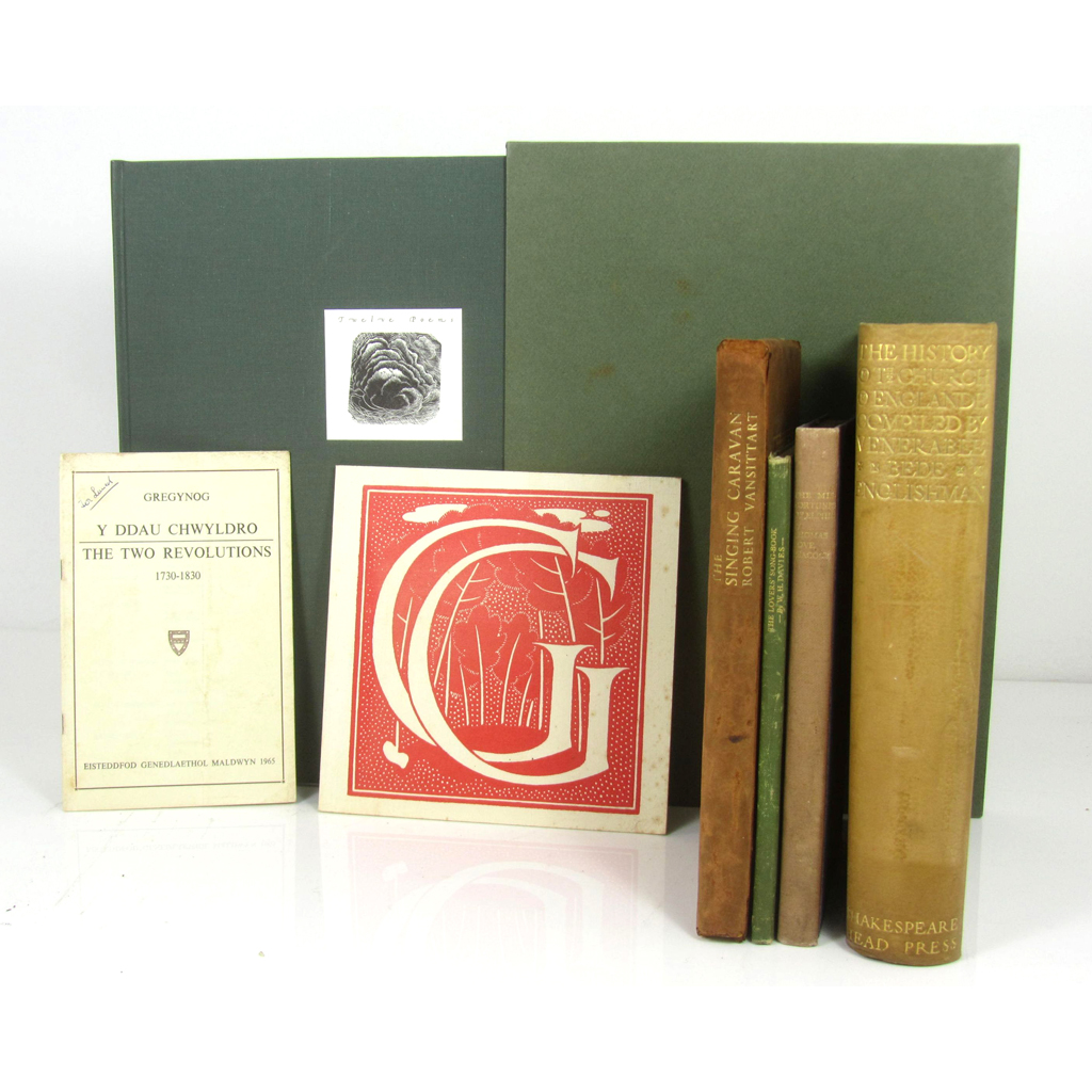 Burnett, David Twelve Poems. Bath: The Old School Press, 1994. Folio, one of 135 copies, signed, original green cloth, slipcase; Vanstittart, Robert The Singing Caravan. Newtown: Gregynog Press, 1932. 8vo, one of 250 copies, original calf, gilt, some rubbing, joints split; Davies, W.H. The Lovers' Song-Book. Newtown: Gregynog Press, 1933. 8vo, one of 250 copies, original green quarter cloth gilt; Love Peacock, Thomas The Misfortunes of Elphin. Newtown: Gregynog Press, 1928. 8vo, one of 250 copies, original cloth; [Hughes, Glyn Tegai] The Two Revolutions 1730-1830. Gwasg Clifton, 1965. 8vo, original paper wrappers; Hutchins, Michael Printing at Gregynog. Gwasg Gregynog, 1976. Square 8vo, original card covers; Bede, the Venerable The History of the Church of Englande. Stratford-upon-Avon: Shakespeare head Press, 1930. 4to, original quarter calf gilt (7)