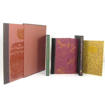 Russell, Richard A History of the Marlborough College Press, 1984. 8vo, one of twenty copies bound in blue goatskin, gilt, slipcase; O'Connor, John Knipton, A Leicestershire Village, 1996. Folio, limited edition, original quarter cloth over printed boards, slipcase; [Various Authors] A Garland for the Laureate. Stratford-upon-Avon: [Whittington Press, for the] Celadine Press, 1981. 8vo, limited edition, original quarter cloth over marbled boards; Reeves, James Arcadian Ballads, 1977. 8vo, one of 50 copies bound in blue morocco gilt by Weatherby Woolnough and signed by the author and illustrator (Edward Ardizzone), slipcase; Thomas, Helen A Visit to William Morris, 1979. 8vo, limited edition, original paper wrappers (5)