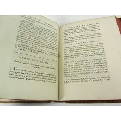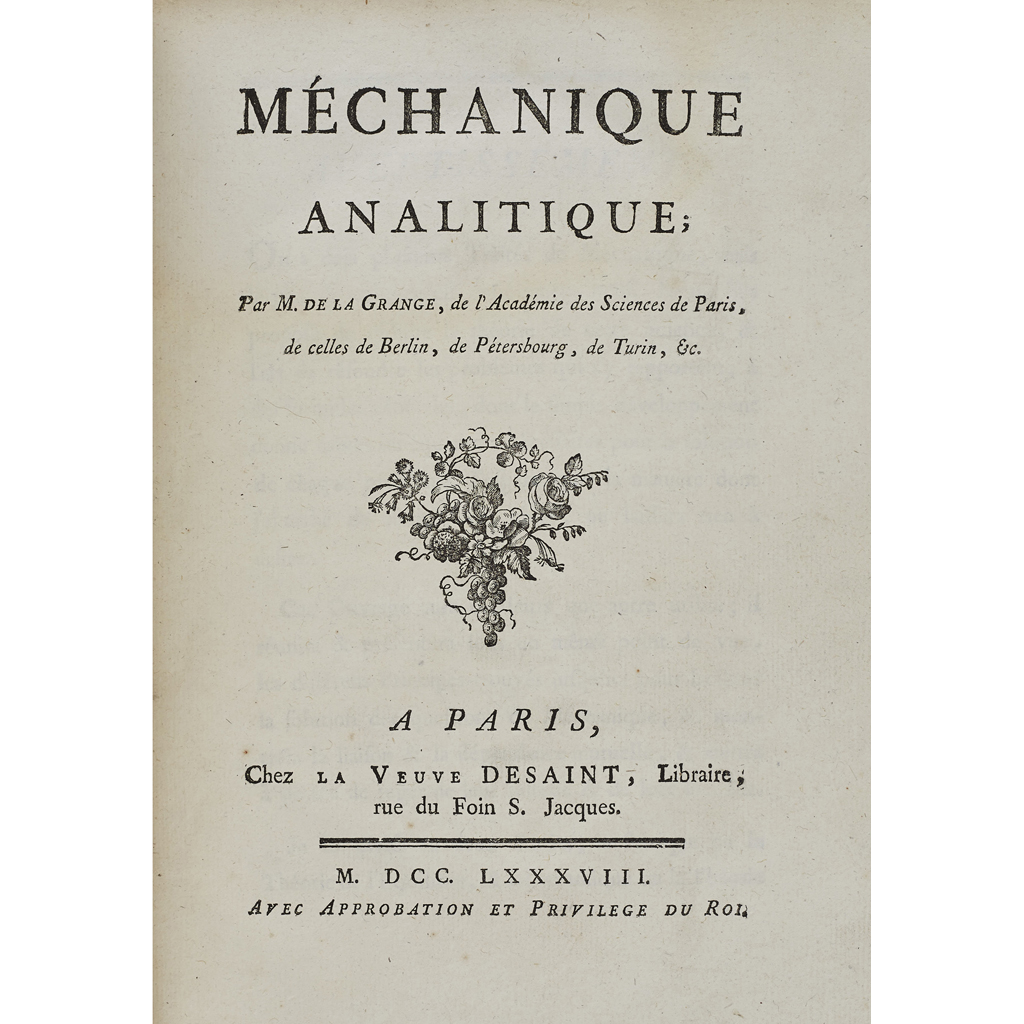 Méchanique Analytique. Paris: La Veuve Desaint, 1788. First edition, 4to., contemporary calf with red morocco gilt label to spine, some occasional internal soiling, closed tear to one page not affecting text, joints split, some rubbing, soiling and chipping to covers