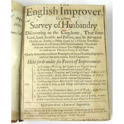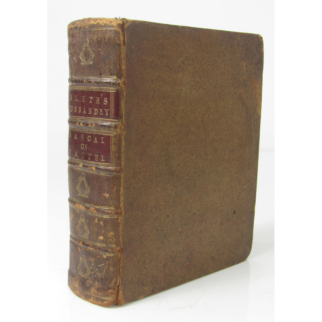 The English Improver, or a New Survey of Husbandry. London: J. Wright, 1649. First edition, 2nd issue, small 4to., [ESTC R16946]; Blith, Walter [Engraved title:] "The English Improver improved or the Survey of Husbandry Surveyed.." , [Printed title:] "All clearly demonstrated from principles of reason, ingenuity, and late but most real experiences...". London: Printed for John Wright, 1653, 3rd edition [2nd issue, i.e. actually 4th printing], 1 folded plate, printed title with imprint cropped, [ESTC R16683]; Mascall, Leonard The Government of Cattel. Divided into three books. London: for John Stafford and W.G., 1662, 5th edition under this title; lacks engraved title and the folding plate, [ESTC R217472], 3 volumes in one, early 18th century calf, sometimes close trimmed with loss of a few letters, lower joint split