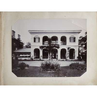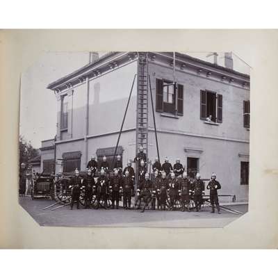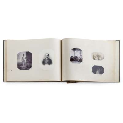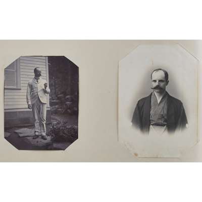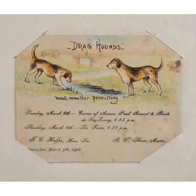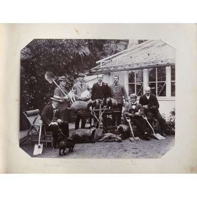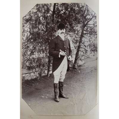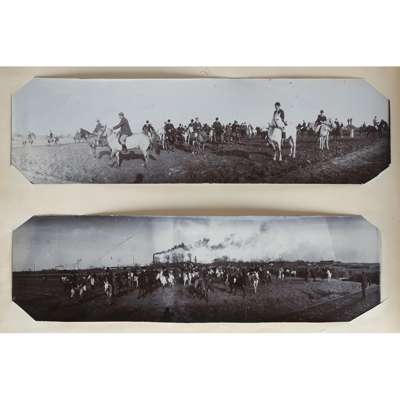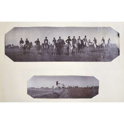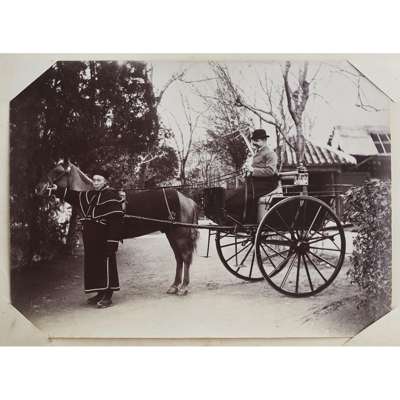 Photograph album, comprising 97 photographs in mixed medias and sizes of China and Japan, late C.19th, including many intimate images of family life, personal and candid photographs and several portraits with Mr Schröder and his favoured horses and friends, including a 'Drag Hounds' hunting invitation dated Shanghai, 5 March 1906, accompanied by many images of hounds on the hunt and cordial shots of the hunting party with their spoil, some images include Mr Schröder and his wife in traditional robes, on family picnics and posing with a stuffed tiger, with other images including European officer portraits and military regiments in formation in the streets of Shanghai; included are three photographs entitled "85 General View of Otsu City from Midera" "B.8 Sarusawasnara" and "Y20 Kasuga Temple at Nara"