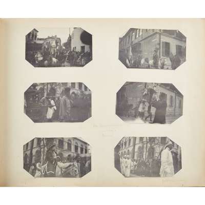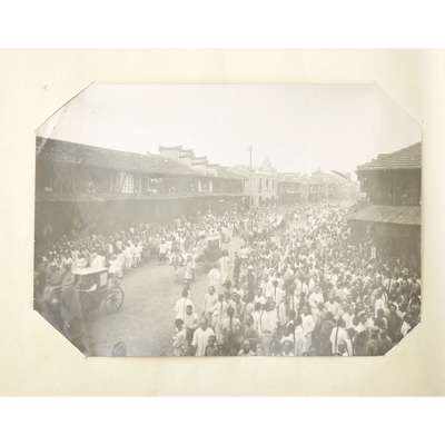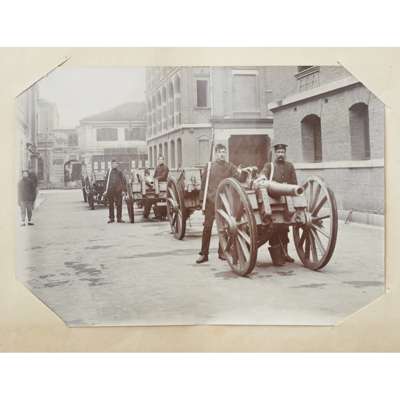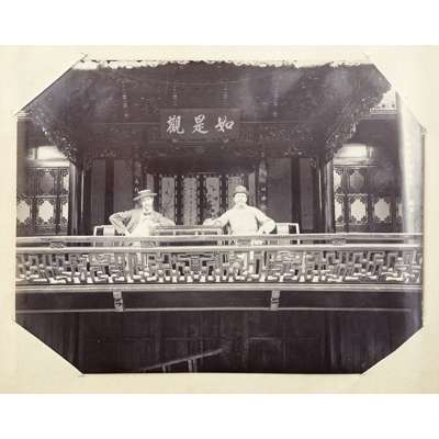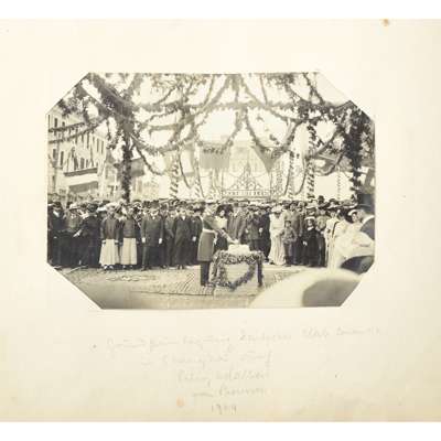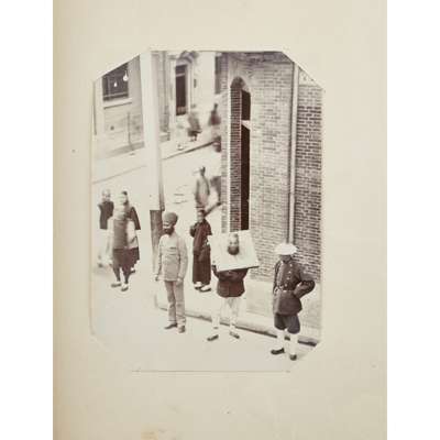 Photograph album, comprising 111 personal photographs of Shanghai, early 20th century, including several images of military ships, various English language shop signs for local businesses (for example Shung-Yuen the blacksmith), 12 photographs from the burial procession of the mother of Pau Ching Po, a business man in Shanghai, and several photographs of the 1911 Xinhai Revolution in Shanghai, which resulted in the overthrowing of the last Imperial monarchy in China and the establishment of the Republic of China in 1912; also including photographs of the German Theatre in the Lyceum, which was founded in 1930 as an amateur dramatics society, a photograph of the Prince Adalbert of Prussia (1884-1948) at the Club Concordia in 1904 as he laid the founding stone to the new German club in Shanghai, and three photographs of the wedding of Wilhelm Knappe (1855-1910), the German Consul-General in Shanghai from 1899-1906, largest photograph 21.2cm x 15.5cm