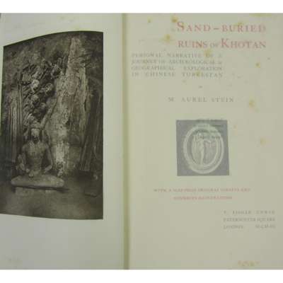 Sand-Buried Ruins of Khotan. Personal Narrative of a Journey of Archaeological & Geographical Exploration in Chinese Turkestan. London: T. Fisher Unwin, 1903. First edition, 8vo, frontispiece, folding map, illustrations in text, original brown pictorial cloth, partly unopened, t.e.g., occasional spotting, front inner hinge slightly cracked