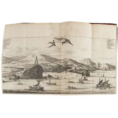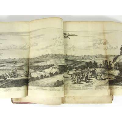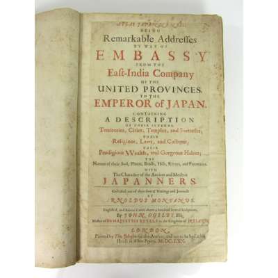 Atlas Japannesis: being Remarkable Addresses by way of Embassy from the East-India Company of the United Provinces to the Emperor of Japan... London: Thomas Johnson, 1670. First edition in English, folio, additional title and 24 folding plates, contemporary calf and paper, lacking map and final leaf with plate list , engraved title, title-page and dedication leaves all laid-down with slight loss, corner of p.1-10 repaired, some dampstaining around inner margins, several folding plates repaired on verso (that at p.98 with slight loss) small hole to pp.421-2 slightly affecting text, a little spotting, covers detached, worn and chipped [ESTC R20211]