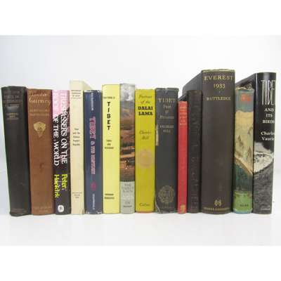 Sport and Travel in the Highlands of Tibet. 1927. First edition, 8vo, plates, map in pocket, original cloth; Bell, Sir Charles Tibet past & present. 1924, original cloth, lacks map at end, worn; David-Neel, A. Tibetan Journey. 1936, original cloth, 1 plate loose, binding slightly soiled; Burrard, S.G. Records of the Survey of India, Volume VIII, Part 2 only. Dehra Dun, 1915. Folio, frontispiece and folding maps 14-21 & 23-24 only (lacking 13 and 22), original quarter cloth; Burrard, S.G. A Sketch of the Geography and Geology of the Himalaya Mountains and Tibet. Delhi, 1933 and Calcutta, 1908, Parts 2 and 4 only, 4to, plates, maps, original wrappers; Morris, J. Living with Lepchas.1938, title-page discoloured; Rockhill, W.W. Notes on the Ethnology of Tibet. [extracted from a Journal], [1933], plates, cloth; Bailey, F.M. China- Tibet - Assam, a Journey, 1911. 1945; Bell, Sir C. Portrait of the Dalai Lama. 1946, dustwrapper; Bell, Sir C. Tibet past & present. [n.d.], dustwrapper; Thomas, Lowell Out of this World. 1951, dustwrapper; Maraini, F. Secret Tibet. 1952; dustwrapper; Herrligkoffer, K.M. Nanga Parbat. 1954, torn dustwrapper; International Commission of Jurists Tibet and the Chinese People's Republic. Geneva, 1960; Li, Tieh-Tseng. Tibet. New York, 1960, dustwrapper; Gelder, S. & R. The Timely Rain. 1964, dustwrapper; Hopkirk, P. Trespassers on the Roof of the World. 1982, presentation copy from the author, dustwrapper; Richardson, H.M. Tibet & its History. 1984, dustwrapper; Ruttledge, Hugh. Everest 1933. 1934, original cloth; Vaurie, Charles Tibet and its Birds. 1972, dustwrapper, library stamp to endpaper; and several loose extracts from the Himalayan Journal relating to Tibet, in a loose clip folder