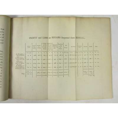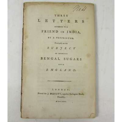 Three Letters addressed to a Friend in India, by a Proprietor. Principally on the Subject of Importing Bengal Sugars into England. London: J. Debrett, 1793. First edition, 8vo., pp. 88, folding table, disbound, first few leaves a little spotted and with a slight damp-stain in the upper margin, [Goldsmiths 15622; ESTC T2945, 7 copies]