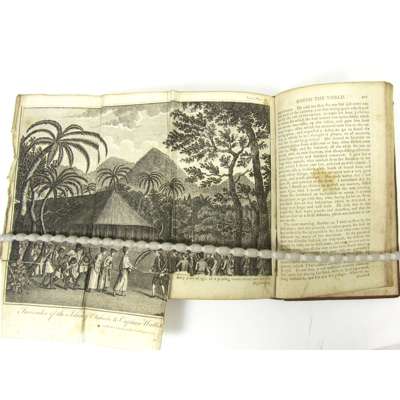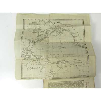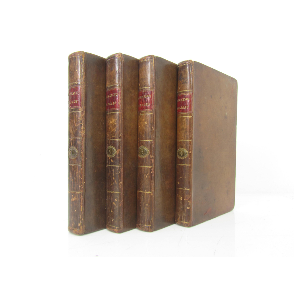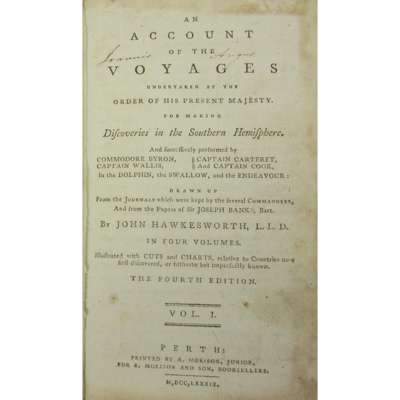 An Account of the Voyages undertaken by the Order of His Present Majesty. For Making Discoveries in the Southern Hemisphere... fourth edition. Perth: R. Morison & Son, 1789. 4 volumes, 12mo., 11 charts and plates (3 folding), contemporary calf, spines gilt, red morocco lettering pieces, folding plate in volume 1 with portion torn away, O3 vol.1 lacks corner with loss of a few letters