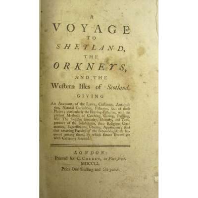 A Voyage to Shetland, the Orkneys and the Western Isles of Scotland. London: C. Corbet, 1751. 8vo, later half calf, bookplates of George Dempster and John M. Slater, some soiling and spotting [ESTC T94722]