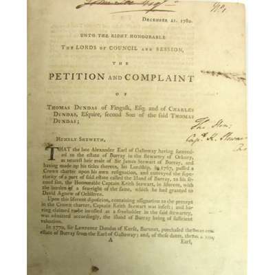 Maitland and Abbotsford Clubs Oppressions of the Sixteenth Century in the Islands of Orkney and Zetland. Edinburgh, 1859. 4to, contemporary straight-grained half morocco; [Orkney Cases Before Court of Sessions, 1780]. 4to, a collection of bound petitions of complaint and answers with annotations in an early hand, some marginalia trimmed, two leaves holed with some loss to text; Acts and Statutes of the Lawting Sheriff and Justice Courts within Orkney and Zetland, 1602-1646. 4to, comprising pp.139-216, orange cloth; List and Certificate of the Number of Examinable Persons in Orkney and Zetland, 1748. 4to, pp.219-223, purple half morocco gilt; Orkney Piers and Harbours Brief of Evidence of Alexander Bain, Provost of Kirkwall. Kirkwall, 1872. 8vo, '...intended exclusively for the perusal of Revd. Charles Clouston...', contemporary red quarter morocco; Mackenzie, James The General Grievances and Oppression of the Isles of Orkney and Shetland. Edinburgh: Neill & Co., 1836. 8vo, green cloth, paper label to spine; Notes of the Decisions of the Appeal Court of Registration at Inverness... Edinburgh: Bell & Bradfute, 1842. 8vo, original boards with cloth spine and paper label, ownership signature to title-page (7)
