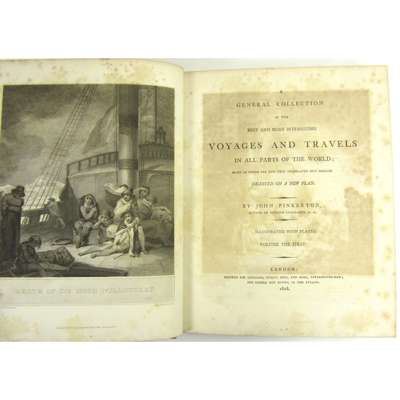 A General Collection of the Best and Most Interesting Voyages and Travels in all Parts of the World. London: Longman, Hurst, Rees, and Orme, 1808. 17 volumes, 4to., 197 leaves of plates, contemporary half calf gilt, rebacked with modern morocco gilt spines, some foxing and offsetting, occasional slight rubbing to covers (17)