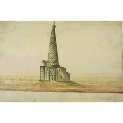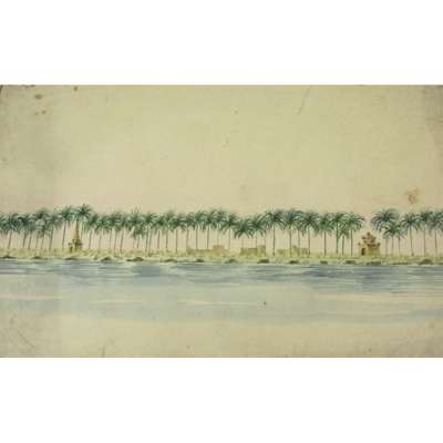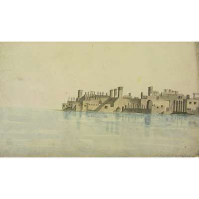 watercolours of a deserted island in Persian Gulf, Muscat, Bassore, mosque in Balsora, tomb on the banks of the Euphrates, Ormus, Penang, Malabar, Church in Mauritius, Longwood (St Helena), a pagoda, &c., most of them cut down, with loss of caption, some with modern caption added in biro, some crudely repaired or laid down, some tears, fraying and soiling, c. 34 x 23cm., modern boards, [c. 1815-17]