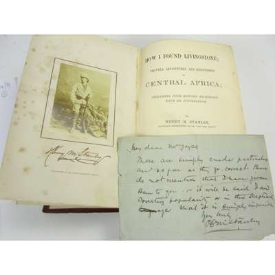 How I Found Livingstone; Travels, Adventures and Discoveries in Central Africa. London: Sampson Low [&c.], 1872. First edition, 8vo, mounted albumen portrait frontispiece, 5 maps (4 folding) & 28 plates, illustrations, with an Autograph Letter Signed to Mr Joyce loosely inserted, asking Joyce not to mention that he has given him unspecified particulars "or it will be said I am courting popularity or in this age that it is simply impossible", original brown pictorial cloth gilt, a few spots, upper hinge slightly weak