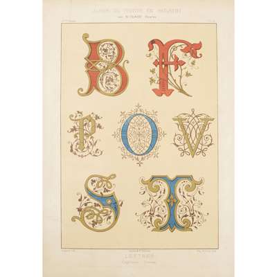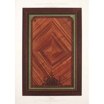 Paris, late 19th century. 2 volumes, folio, 72 chromolithographed plates loose in original brown cloth gilt portfolio cases, with an additional 14 plates from similar publications showing marbling, wood veneers and ideas for wall paintings; Morel et Cie Journal-Manuel de Peintures... Paris, 1850-1852. Folio, 49 chromolithographed plates only (of over 50), contemporary calf, a little rubbed, some internal spotting, one plate with closed marginal cuts; [Idem] Journal-Manuel de Peintures... Paris, 1872-1874. Folio, 47 chromolithographed plates, contemporary quarter calf; sold not subject to return (4)