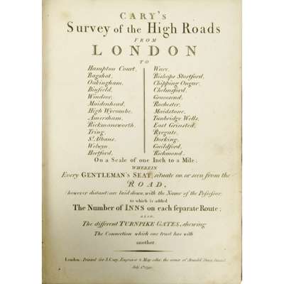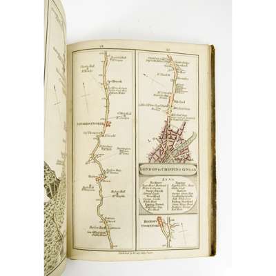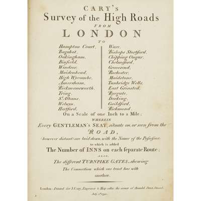 London: J. Cary, 1790. 8vo, comprising 80 strip maps in columns on 40 pages, with a general plan and folding map, hand-coloured, contemporary calf, rubbed, upper cover detached, some spotting