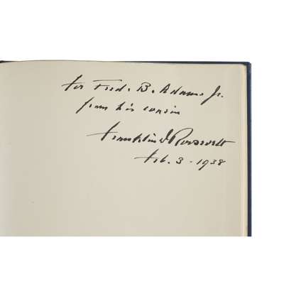 [Washington, 1937] 8vo, frontispiece, folding chart, inscribed to free-endpaper: "For Fred. B. Adams Jr. from... Franklin D. Roosevelt Feb. 3 - 1938", with four loosely inserted photographs from the cruise, original blue cloth gilt; Smithsonian Institution Explorations and Field-Work of the Smithsonian Institution in 1938. Washington, 1939. 8vo, signed and inscribed to Adams from Roosevelt, with a loosely inserted addressed envelope from the third presidential cruise, contemporary blue half morocco, rubbed; Letter typed, signed, from Franklin D. Roosevelt to Mr Evaristo Ferreirs Trevassos of the Azores, dated October 21st 1918, thanking him for sending a letter and photographs (3)