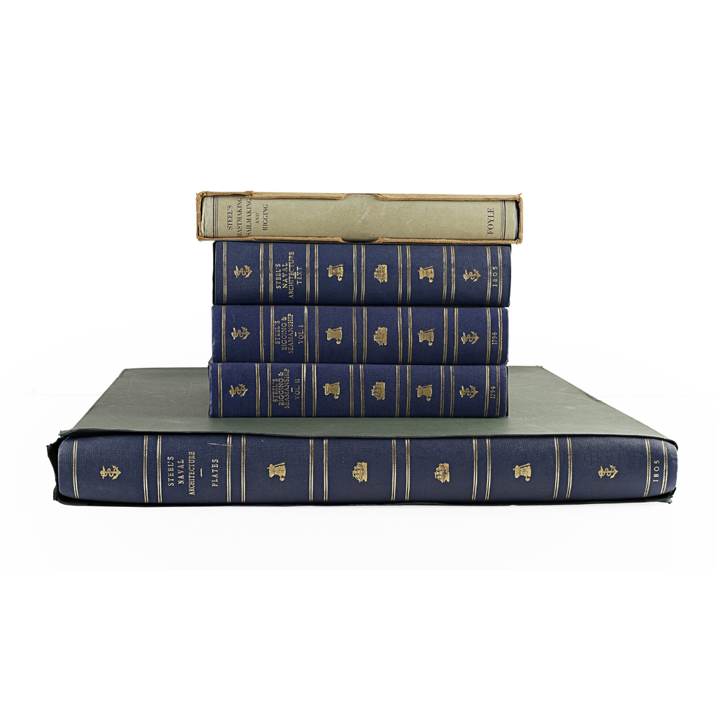 Sim Comfort, 1977. 4to and folio, atlas with 38 plates, original blue cloth gilt, slipcases; Steel, David The Elements and Practice of Rigging and Seamanship. Sim Comfort, 1978, 2 volumes, 4to, original blue cloth gilt, slipcases; Steel, David Steel's Elements of Mastmaking, Sailmaking and Rigging. 1932. 4to, original cloth, dustwrapper, slipcase (5)