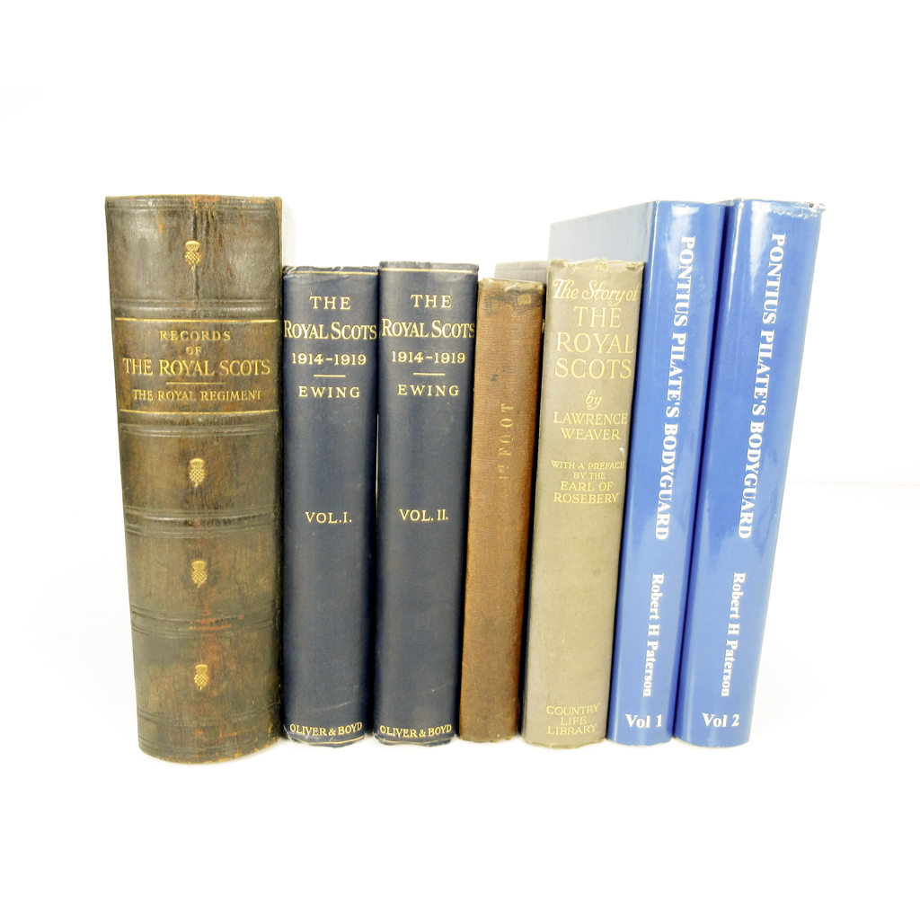 Leask, J.C. and McCance, H.M. The Regimental Records of The Royal Scots. Dublin: Alexander Thom & Co., Ltd., 1915. Small 4to, contemporary calf with gilt thistle tooling to spines and the monogram of King George V to the upper cover, gift inscription to flyleaf; Ewing, John The Royal Scots 1914-1919. Edinburgh: Oliver and Boyd, 1925. 2 volumes, 8vo, original blue cloth gilt; Cannon, Richard Historical Records of the British Army. London, [n.d.] 8vo, original red cloth gilt; Weaver, Lawrence The Story of the Royal Scots. London: Country Life, [n.d.] 8vo, original blue cloth; Paterson, Robert H. Pontius Pilate's Bodyguard, a history of the first Royal Regiment of Foot, The Royal Scots. Edinburgh: The Royal Scots History Committee, 2001. 2 volumes, original cloth, dust-jackets (7)