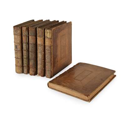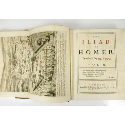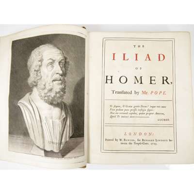 London, 1715-20. First edition of Pope's translation, 6 volumes, 4to, titles printed in red & black, 1 engraved portrait & double-page map (in vol.1), 1 folding frontispiece (in vol.2), WITH THE SHIELD OF ACHILLES PLATE IN VOLUME 5, half-title and list of subscribers in volume 1, engraved head-pieces and initials, no initial license leaf in volume 3, contemporary panelled calf, worn, two covers detached, slightly dampstained at beginning of volume 6, armorial bookplates of Sir John Ligonier (6), Title-page measures 10 1/2 x 8 1/4 inches.