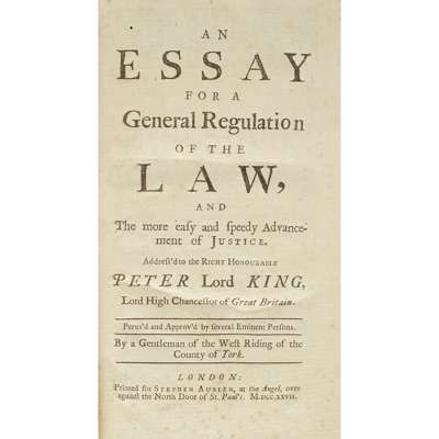 London: J. Robinson & J. Wyat, 1703. Second edition, 8vo, contemporary calf, bookplate of the Earl of Lovelace; King, Peter, 1st Baron King An Essay for a General Regulation of the Law. London: S. Austen, 1737. First edition, 8vo, 8pp. publisher's advertisements at end, contemporary calf, rubbed (2)