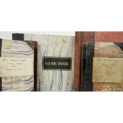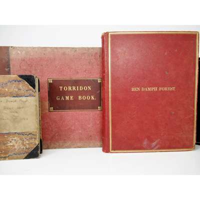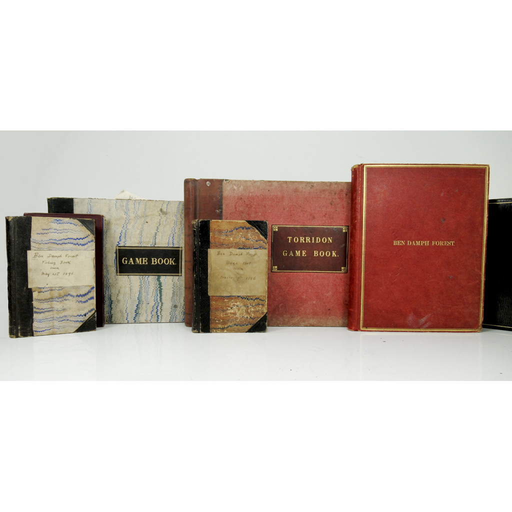 oblong folio, half calf; Ben Damph Forest Stags shot since January 1st 1886. [-1930], 8vo, half morocco; Ben Damph Forest Fishing Book since May 21st 1896 [- 1927], half morocco; Ben Damph Forest 1887-1953, 4to, red morocco gilt; and 5 other game & fishing books books, 1 visitor's book & 1 Ben Damph Forest Lett's Cellar book listing quantity of brandy, champagne, wine, port, claret & whisky purchased 1901-29, 8vo, original cloth (13)