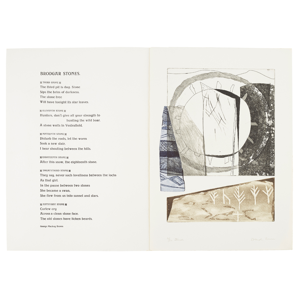[Stromness], Orkney: Solisquoy Printmakers Workshop, 1989. Folio, number 4 of 30 copies produced, signed in pencil to the title-page by all four contributing poets and all four contributing artists [Christina Smith, John Cumming, Erlend Brown and Jeremy Baster], comprising four printed poems and four accompanying limited edition prints, each signed by the artist, loose bifolia in original portfolio case with ties, a little foxing to covers and slightly to title-page