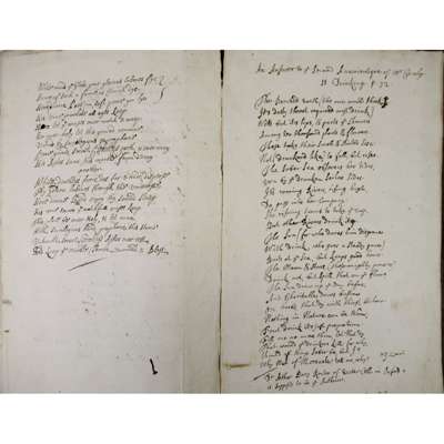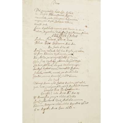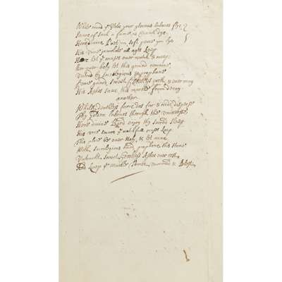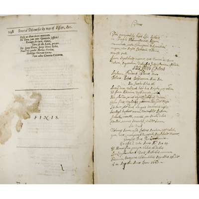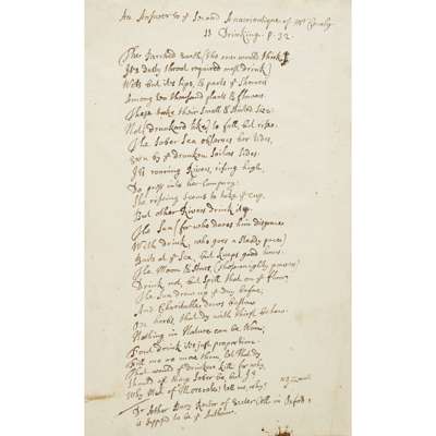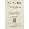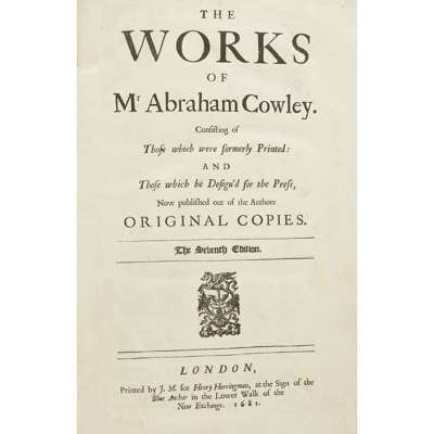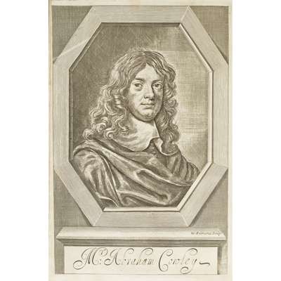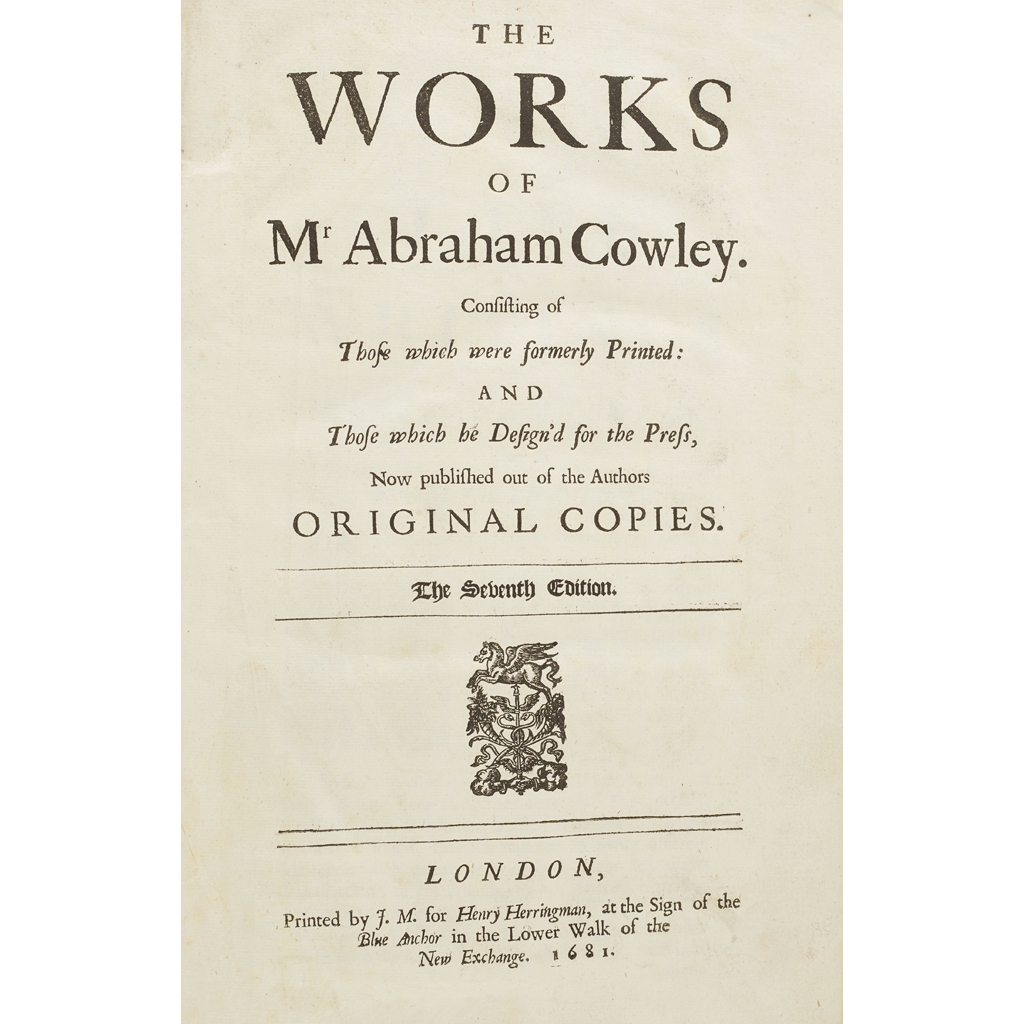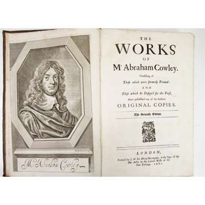 London: for Henry Herringman, 1681. Seventh edition, 4to, engraved frontispiece portrait, contemporary calf, a few very small wormholes in inner margin at end, 3pp. interesting contemporary manuscript annotations at end, quoting Abrahamus Couleus, 2 stanzas of a poem "While round the Globe your glorious labours flye, Secure of such a fame as Cannot dye.." and a 26 line poem "An Answer to the Second Anacriontique or Mr Cowly ii Drinking, p.32: