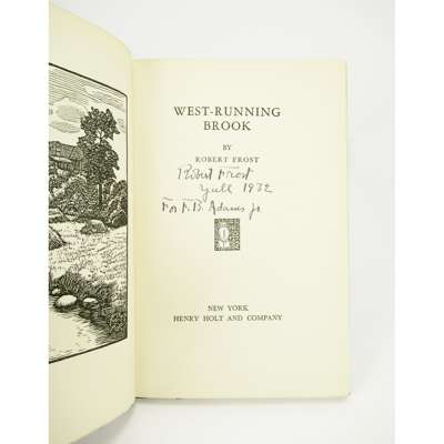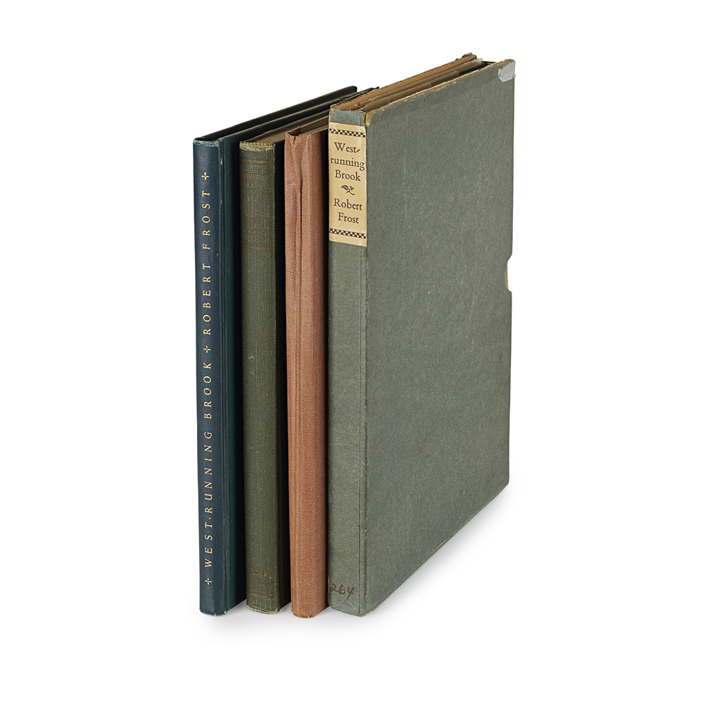 Mountain Interval. New York: Henry Holt and Company, 1921. Second edition, 8vo, signed by Robert Frost and dated Amherst June 1924 to free-endpaper, original quarter cloth gilt, bookplate; [Idem] West-Running Brook. New York: Henry Holt and Company, [1928]. First edition, 8vo, number 264 of 1000 copies, signed by Robert Frost and Graham B. Munson, original green quarter cloth gilt over patterned boards; and another copy, not limited edition, signed and inscribed from Robert Frost to F.B. Adams in Fall 1932 to title-page, original quarter cloth gilt, bookplate; [Idem] A Way Out. New York: The Harbor Press, 1929. 8vo, original quarter cloth (4)