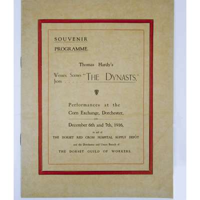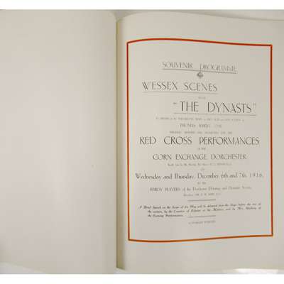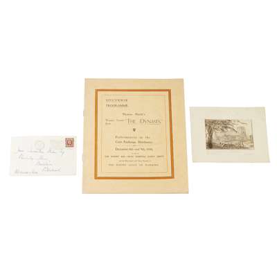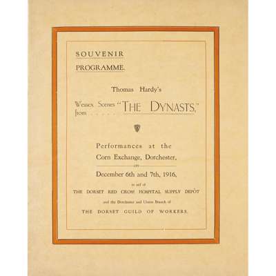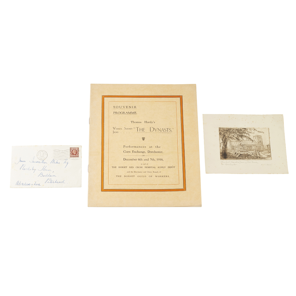 Performances at the Corn Exchange, Dorchester, on December 6th and 7th, 1916. 4to, (285 x 225mm.), original printed salmon wrappers; Hardy, Mrs Florence Autograph letter signed to James Fairweather Milne regarding "photograph of the map of Wessex drawn by my late husband", 13 June 1936, with envelope; Hardy, Mrs Florence Autograph letter signed regarding the reproductions "of the map of Wessex drawn by my husband", 21 October, [1936], with envelope (3)