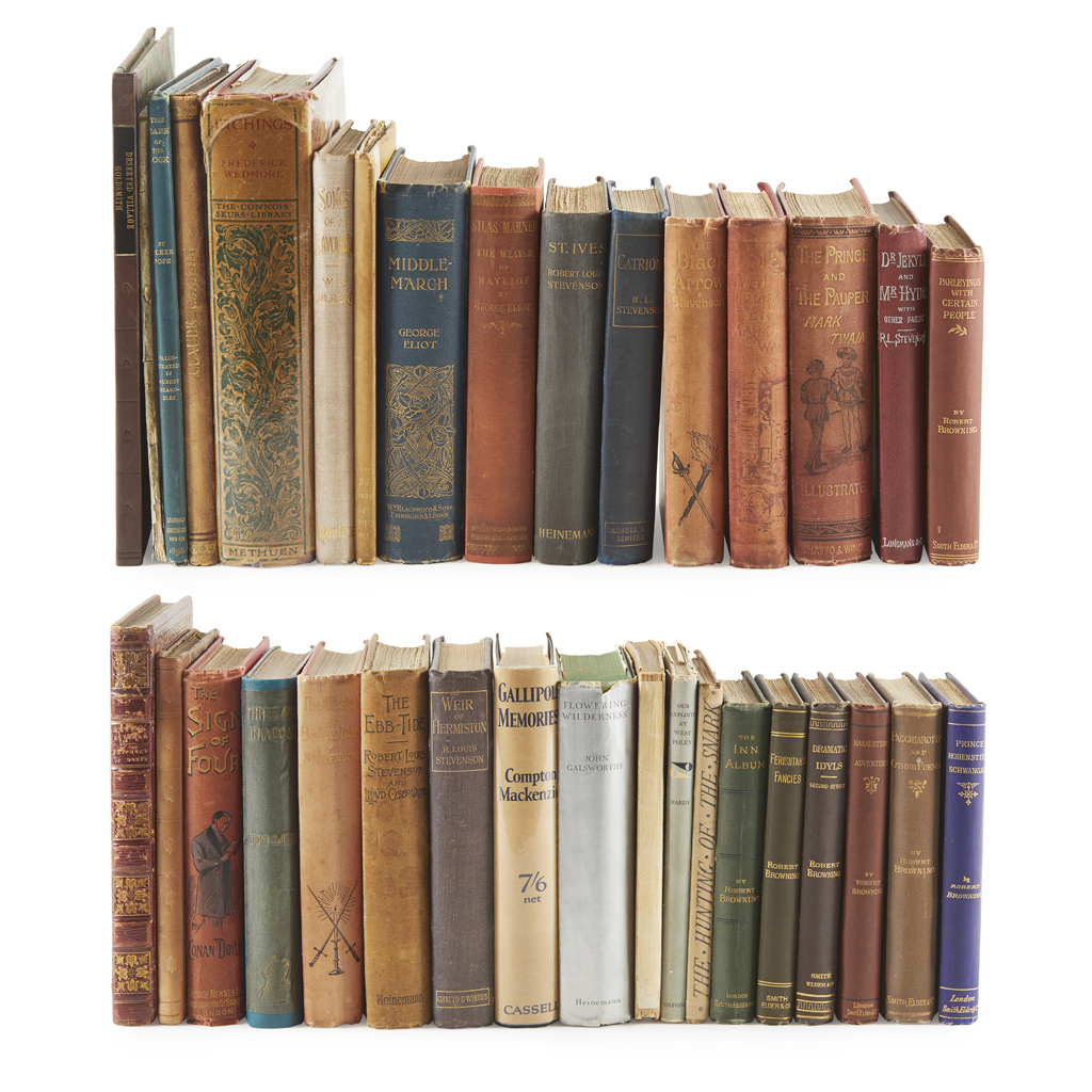 Silas Marner... Edinburgh & London: William Blackwood and Sons, 1861. First edition, 8vo, original orange cloth rebacked, 16pp. of adverts and 4pp. Carlyle autobiography with some tears; [Idem] Middlemarch. Edinburgh & London: William Blackwood and Sons, [n.d. but 1876.] 8vo, original blue cloth gilt; Stevenson, R.L. The Strange Case of Dr. Jekyll and Mr. Hyde, with other Fables. London: Longmans, Green, and Co., 1896. 8vo, original maroon cloth; and 6 other works by Stevenson; Twain, Mark [Clemens, Samuel Longhorne] The Prince and the Pauper. London: Chatto & Windus, 1881. First edition, 8vo, original cloth gilt; and another by Twain; Jerome, Jerome K. Three Men in a Boat. Bristol: J.W. Arrowsmith, 1889. First edition, second issue, 8vo, original blue cloth rebacked; Conan Doyle, Sir Arthur The Sign of Four. London: George Newnes, Limited, 1893. Third edition, 8vo, original pictorial cloth; Galsworthy, John Flowering Wilderness. London: William Heinemann, [1932]. First edition, 8vo, original cloth, dust-jacket not price-clipped, with a loose letter dated March 1930, signed by Galsworthy; Pope, Alexander - Aubrey Beardsley The Rape of the Lock. London: Leonard Smithers, 1896. 4to, original blue cloth gilt, section trimmed from title-page and dedication; Browning, Robert Prince Hohenstiel-Schwangau, Saviour of Society. London: Smith, Elder and Co., 1871. First edition, 8vo, original blue cloth gilt, bookplate of Eleanor, Countess of Castle Stewart; and 6 others by Browning (5 with the same bookplate); Byron, George Gordon, Lord Marino Faliero... London: John Murray, 1821. 8vo, contemporary red morocco gilt; and 9 others, including two 18th century Goldsmith works (34)