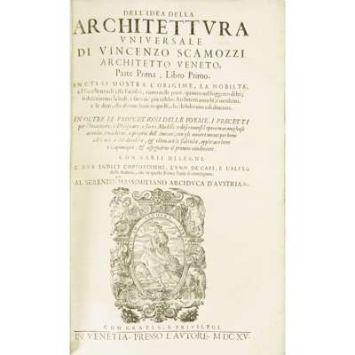 Note: Vincenzo Scamozzi (1548 -1616) was an Italian architect and a writer on architecture, active mainly in Vicenza and the Republic of Venice area in the second half of the 16th century. He was perhaps the most important figure there between Andrea Palladio, whose unfinished projects he inherited at Palladio's death in 1580, and Baldassarre Longhena, Scamozzi's only pupil. Scamozzi's influence spread far beyond his Italian commissions through his two-volume treatise, L'Idea dell'Architettura Universale, which is one of the last works of the Renaissance dealing with the theory of architecture.