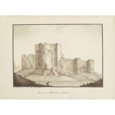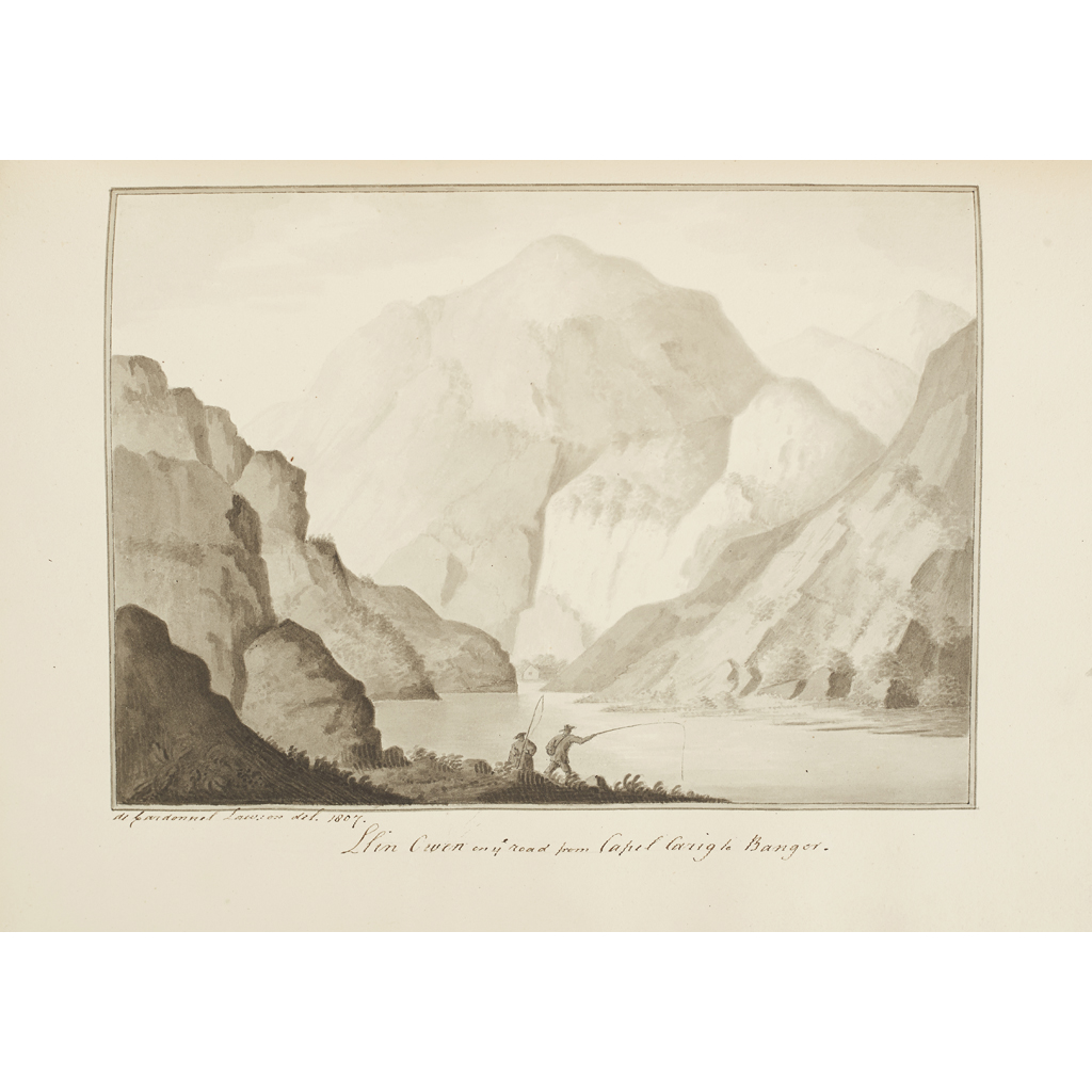 50 grey wash sketches, all signed and dated 1806-07, including views of Tintern, Chepstow Castle, Pont y Pridd, Vale of Llantisilio, Cymmo Mill near Llantisillo, Neath Abbey, Junction of the Conway & Mackno, Near ye Falls of Ye Conway, River Dee, &c., 160 x 217mm., contemporary half calf, bookplate of Mansf. de Cardonnel Lanson and Findlay of Easterhill, rubbed, joints split