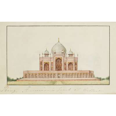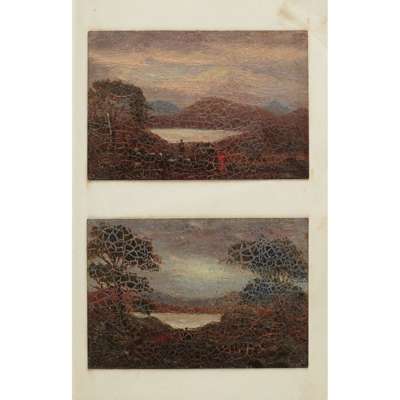 74 leaves in a small cloth gilt album, 18.5 x 11.5cm, the first leaf with an illustration reading "H. Swinton Inverlieth Place", subsequent leaves contain a small Company School illustration of an Indian palace, 7 small oil paintings of landscapes and various sections of writing