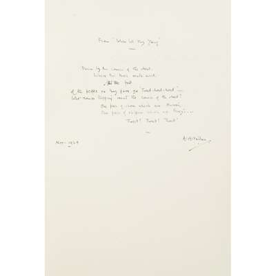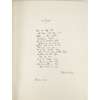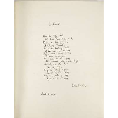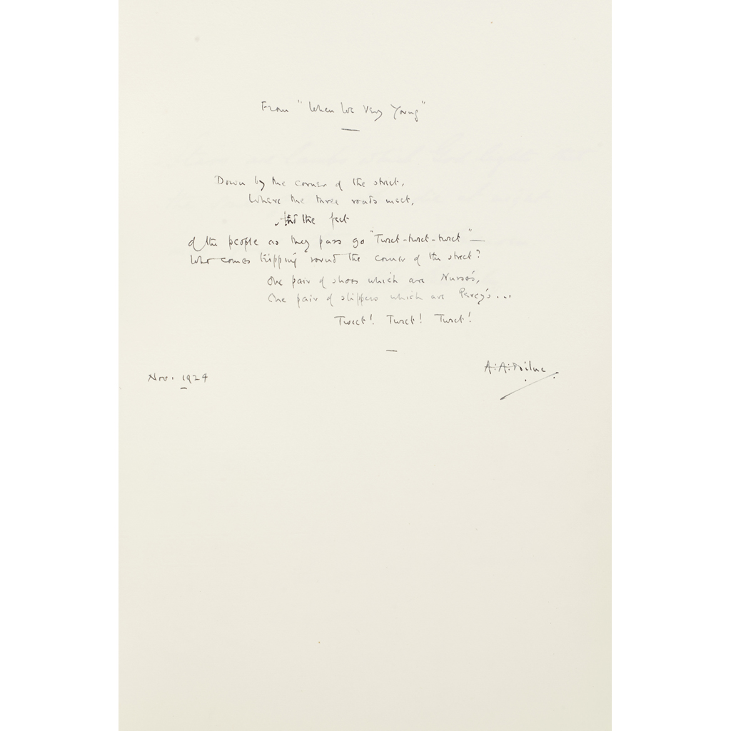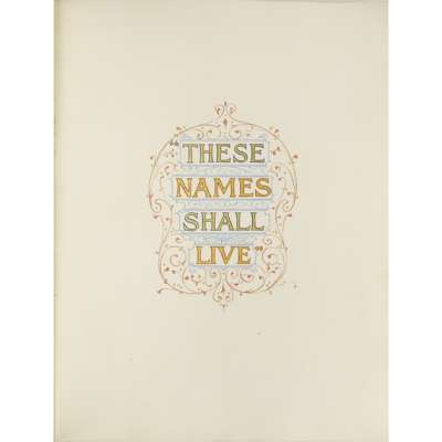 vellum bound album, 28 x 22cm, with the illuminated manuscript title-page "These Names Shall Live" and 21 leaves each completed by a separate figure, comprising Hugh Robert Mill with an extract from "The Life of Sir Ernest Shackleton", Arthur C. Benson, J.M. Barrie writing "Those who bring happiness into the lives of others cannot keep it from themselves", E.V. Lucas, Walter de la Mare copying out his poem "The Linnet", Donald MacAlister of Tarbert, John Ferguson, Jan Hay, Laurence Binyon copying out "For the Fallen", Sir John Adcock with his poem "Distance", A.A. Milne with an excerpt from "When We Were Very Young", Warwick Deeping, John Buchan writing about peace, Hugh Chesterman with "Orpheus, the Sweet Singer", John Galsworthy with "The Downs", Ernest Raymond, John Joy Bell with "Belief" and 4 others, several of the excerpts and poems seem to relate to the theme of war
