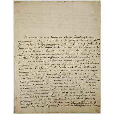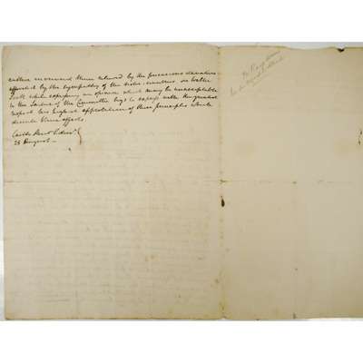 apologising for not replying sooner to the Committee of Ladies for relief of the Irish peasantry "he has it not in his power to be useful to them on the present occasion. Upon the first breaking out of the general distress in Ireland as much was done in the behalf of the sufferers in Scotland as could be expected in a country at present suffering greatly from unpaid rent, and a general depreciation of agricultural produce. It appears to Sir Walter Scott that although sudden and immediate distress wherever it occurs ought to be the subject of general sympathy & benevolence yet when that distress is protracted it becomes the duty of the local government where it occurs to provide in a permanent manner against so unfortunate an evil since moreover that evil must become progressive & universal. Sir Walter Scott without knowing much of the state of Ireland otherwise than from what is found in everyones observation cannot but apprehend that that fine Kingdom is in a situation where the combined & continued efforts of the legislature and Landholder can alone offer any effectual relief to the suffering peasantry, & that their condition may perhaps rather increase those relieved by the precious donations afforded by the sympathy of the sister countries.", Castle Street, Edinburgh, 25 August -, 2 pp, 4to, integral blank