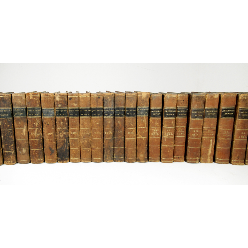 the Edinburgh Review. Edinburgh: Archibald Constable, 1803-1819. 28 volumes comprising volumes: 1-12, 14-17, 19, 21-27 and 29-32, 8vo, contemporary quarter calf with vellum corners; The Quarterly Review London: John Murray, 1820-1842. 43 volumes, comprising volumes 23-24, 26-39, 41-57 and 67-70, 8vo, contemporary half half; sold as periodicals not subject to return (71)