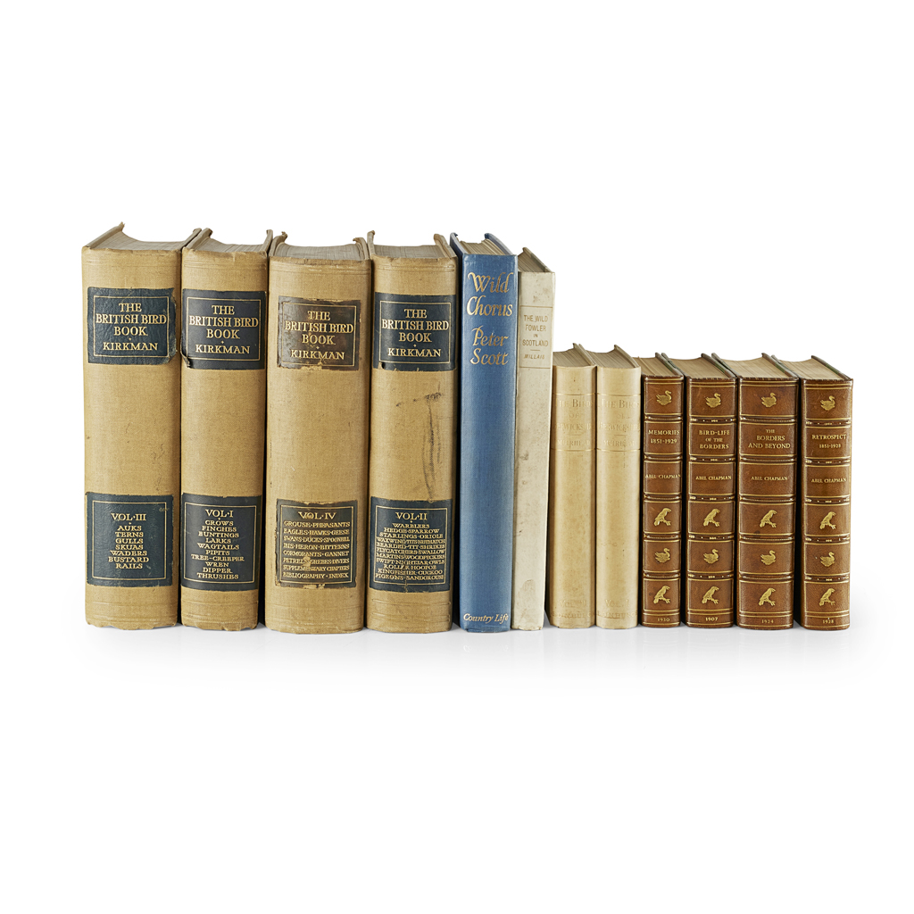 Wild Chorus. London, 1938. First edition, 4to, number 1152 of 1250 copies signed by the author, plates, original blue pictorial buckram gilt, t.e.g.; Millais, J.G. The Wildfowler in Scotland. 1901. 4to, plates, original half vellum, binding slightly soiled; Chapman, Abel Memories, 1930; Retrospect, 1928; Bird Life of the Borders, 1907; The Borders and Beyond, 1924, uniform green half morocco, emblematically tooled on spines, t.e.g., spines slightly faded; Muirhead, George The Birds of Berwickshire. Edinburgh, 1889. 2 volumes, 8vo, presentation copy from the author to Sir Archibald H. Dunbar, Bart. of Northfield, from the author, folding map, illustrations, original white cloth, t.e.g., spines slightly discoloured, bindings lightly marked; Kirkman, F.B. The British Bird Book. 1911. 4 volumes, 4to, plates, original buff buckram, green morocco labels, bindings slightly soiled (12)